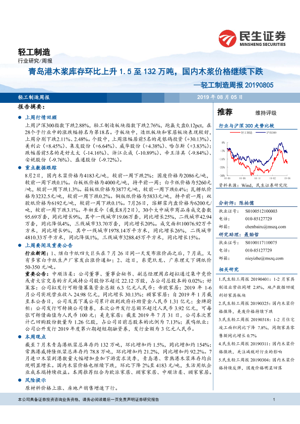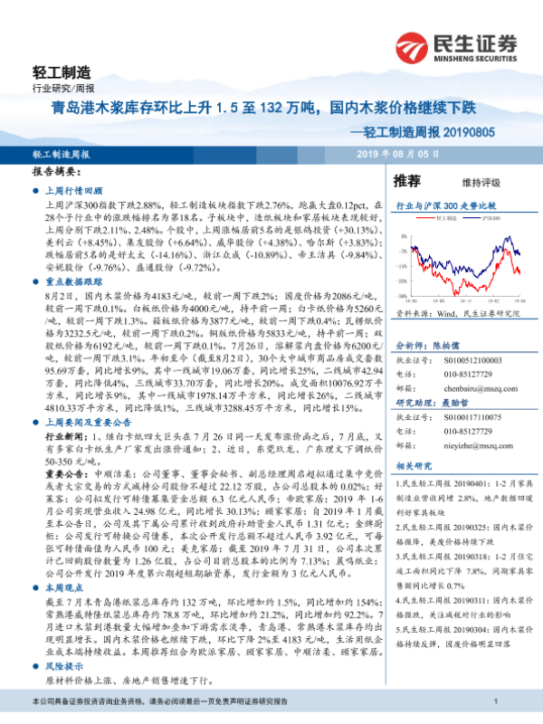 【民生证券】【20190805】20190805-民生证券-轻工制造周报:青岛港木浆库存环比上升1.5至132万吨,国内木浆价格继续下跌-17页