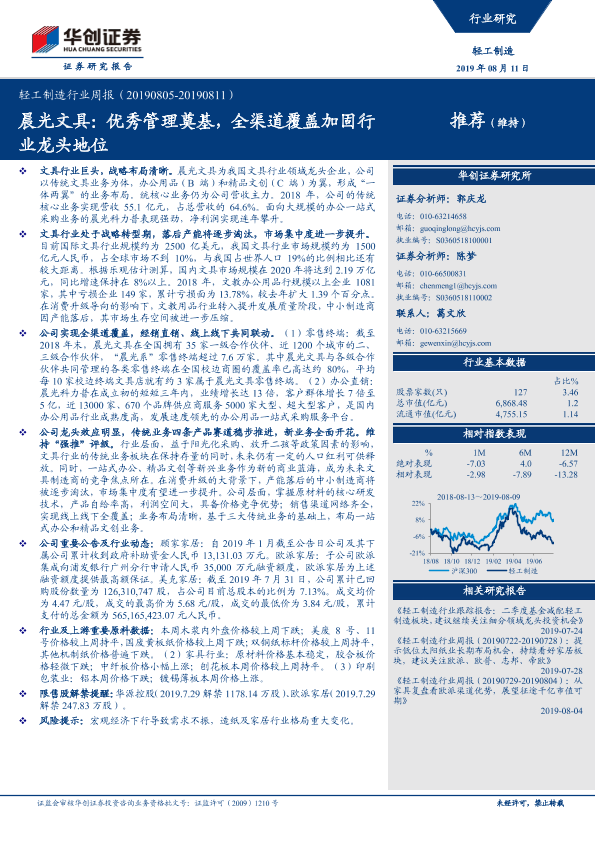 【华创证券】【20190811】轻工制造行业周报:晨光文具:优秀管理奠基,全渠道覆盖加固行业龙头地位-14页