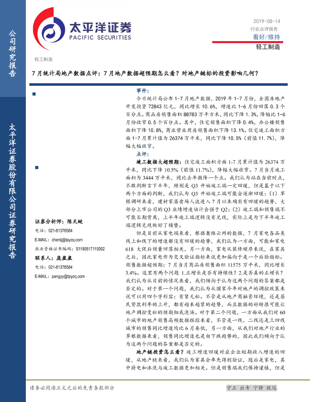 【太平洋证券】【20190814】7月统计局地产数据点评:7月地产数据超预期怎么看?对地产链标的投资影响几何?-5页