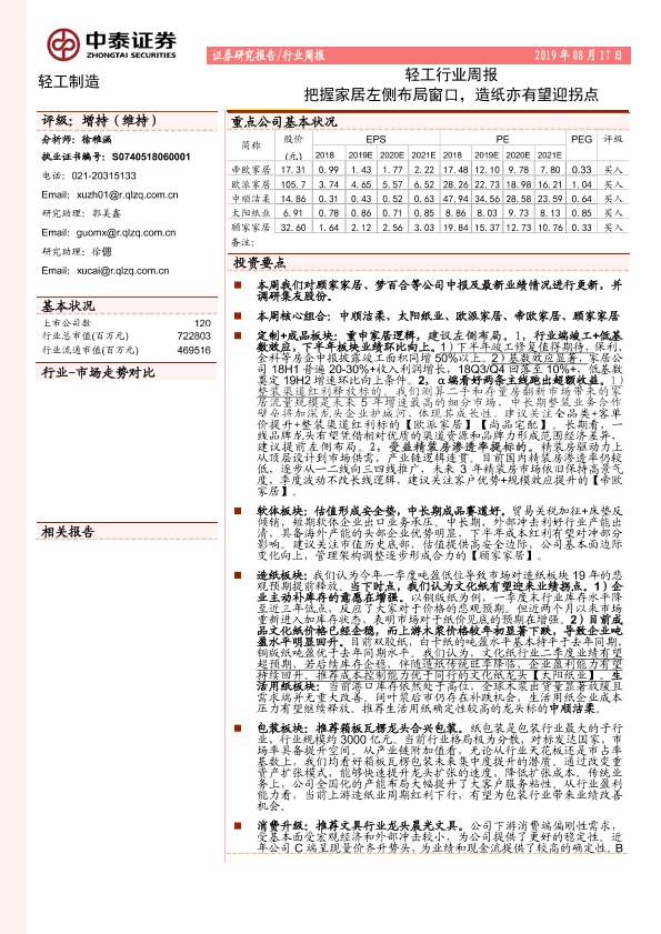【中泰证券】【20190817】20190817-中泰证券-轻工行业周报:把握家居左侧布局窗口,造纸亦有望迎拐点-14页
