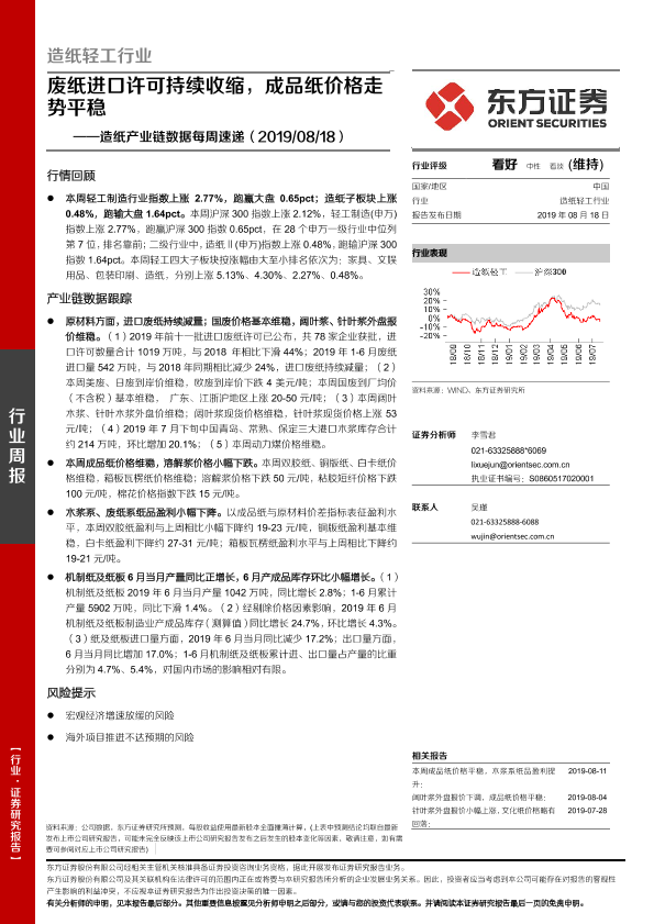 【东方证券】【20190818】20190818-东方证券-造纸产业链数据每周速递:废纸进口许可持续收缩,成品纸价格走势平稳-14页