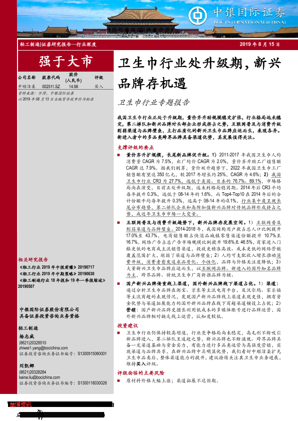 【中银证券】【20190815】卫生巾行业处升级期,新兴品牌存机遇-29页