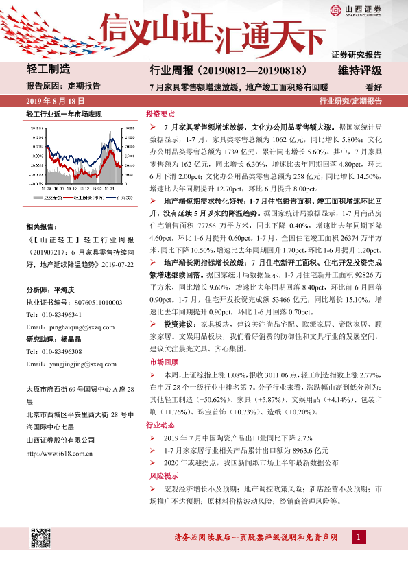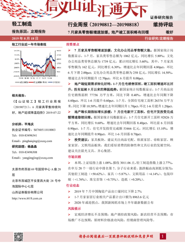 【山西证券】【20190818】20190818-山西证券-轻工行业周报:7月家具零售额增速放缓,地产竣工面积略有回暖-13页