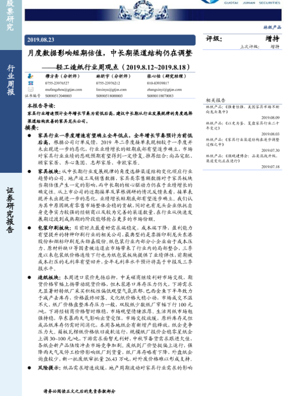 【国泰君安证券】【20190823】轻工造纸行业周观点:月度数据影响短期估值,中长期渠道结构仍在调整-14页