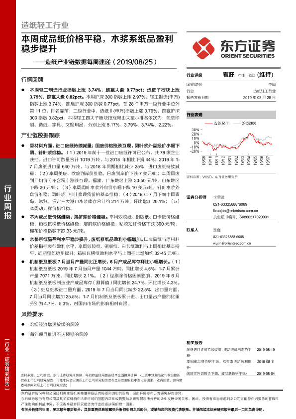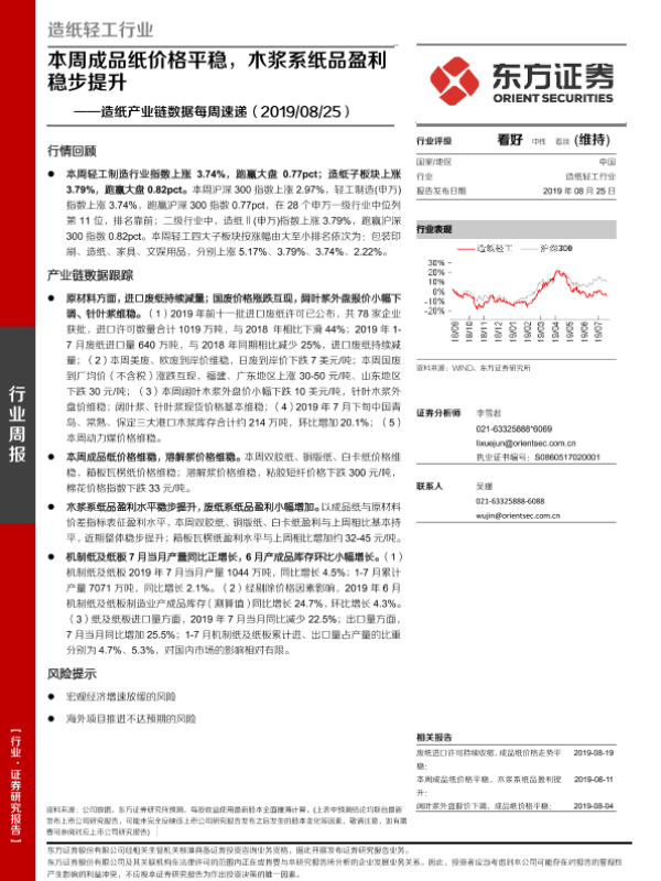 【东方证券】【20190825】20190825-东方证券-造纸产业链数据每周速递:本周成品纸价格平稳,木浆系纸品盈利稳步提升-14页