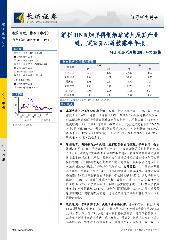 【长城证券】【20190819】轻工制造双周报2019年第25期:解析HNB烟弹再制烟草薄片及其产业链,顾家齐心等披露半年报-35页