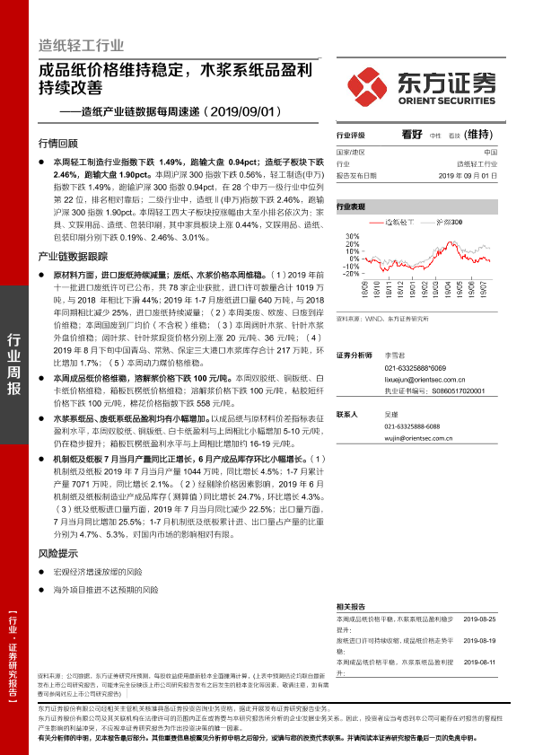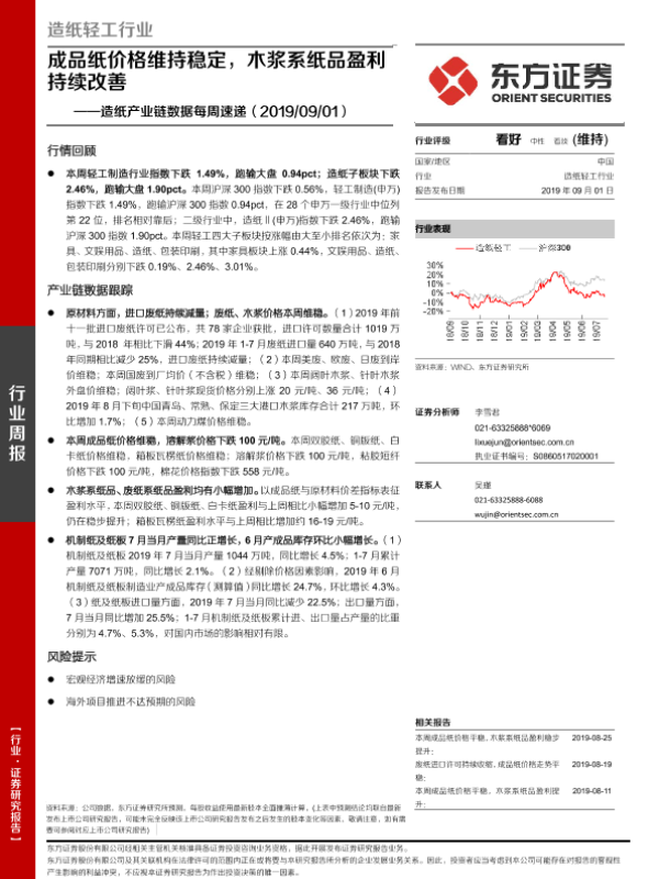【东方证券】【20190901】20190901-东方证券-造纸产业链数据每周速递:成品纸价格维持稳定,木浆系纸品盈利持续改善-14页