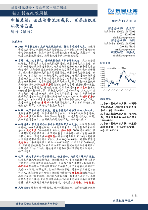 【东吴证券】【20190901】20190901-东吴证券-轻工制造跟踪周报:中报总结:必选消费兑现成长、家居造纸龙头优势凸显-31页