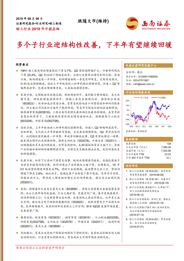 【西南证券】【20190906】轻工行业2019年中报总结:多个子行业迎结构性改善,下半年有望继续回暖-20页