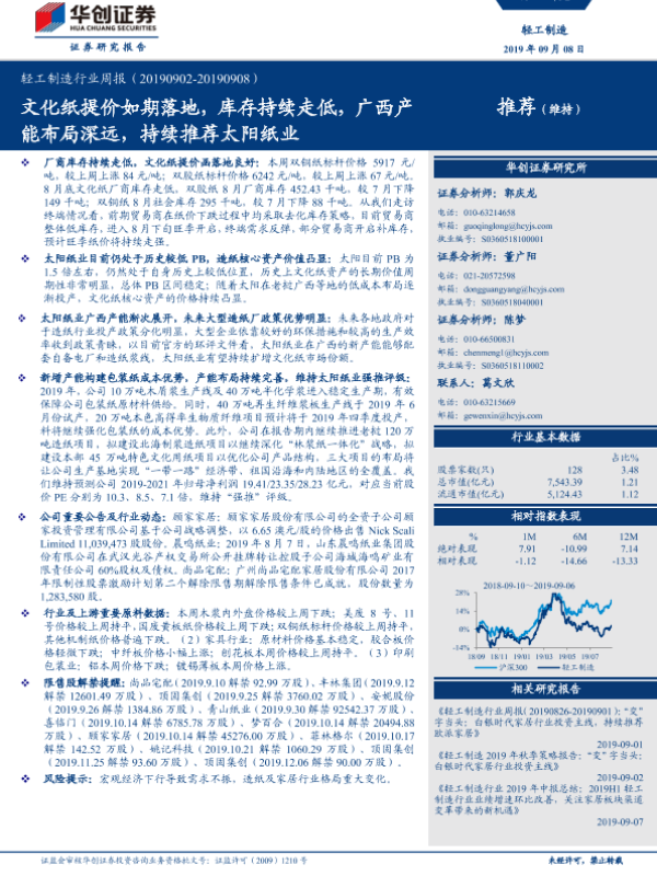 【华创证券】【20190908】20190908-华创证券-轻工制造行业周报:文化纸提价如期落地,库存持续走低,广西产能布局深远,持续推荐太阳纸业-15页