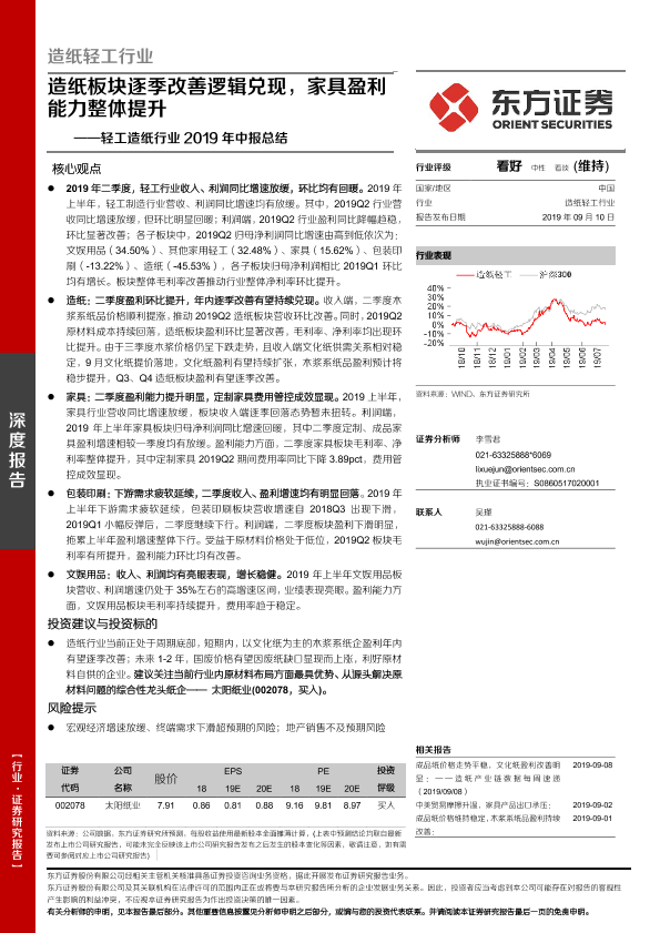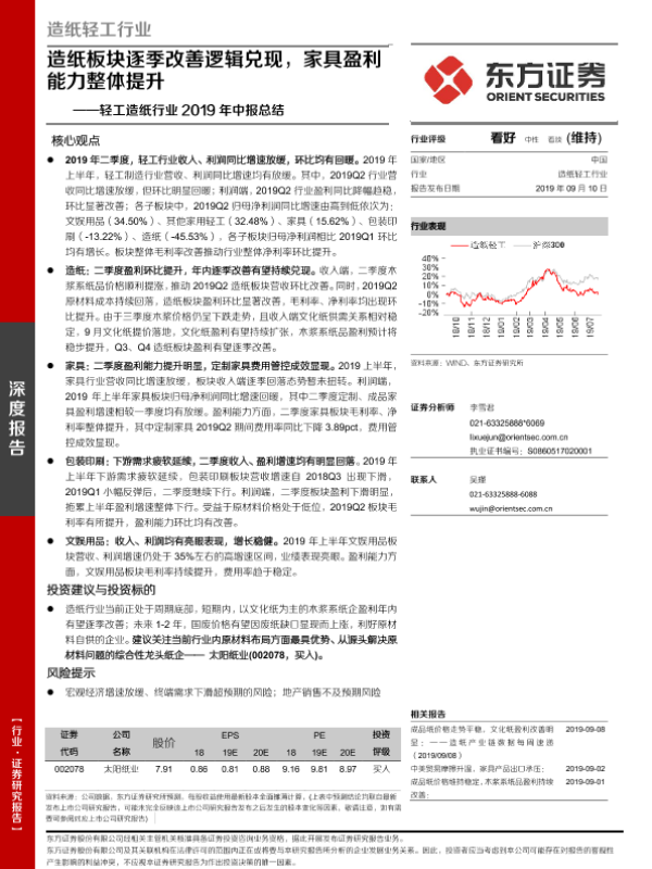 【东方证券】【20190910】轻工造纸行业2019年中报总结:造纸板块逐季改善逻辑兑现,家具盈利能力整体提升-24页