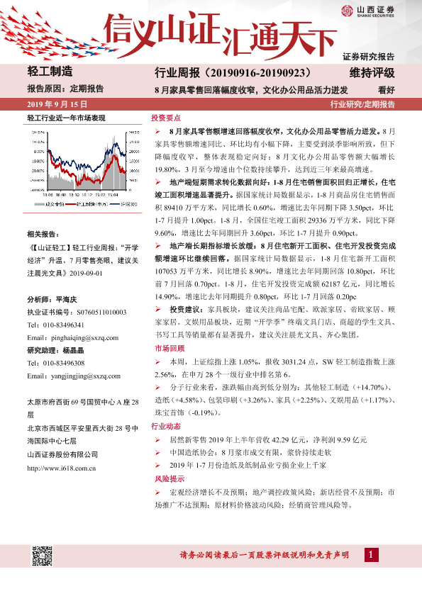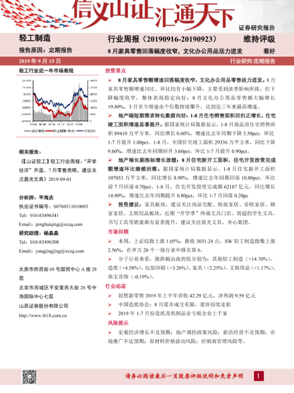 【山西证券】【20190915】轻工制造行业周报:8月家具零售回落幅度收窄,文化办公用品活力迸发-14页
