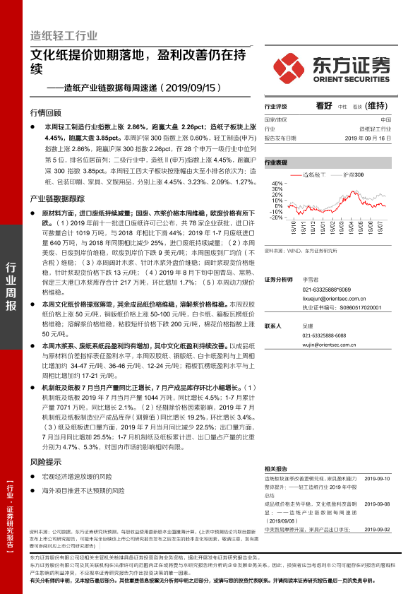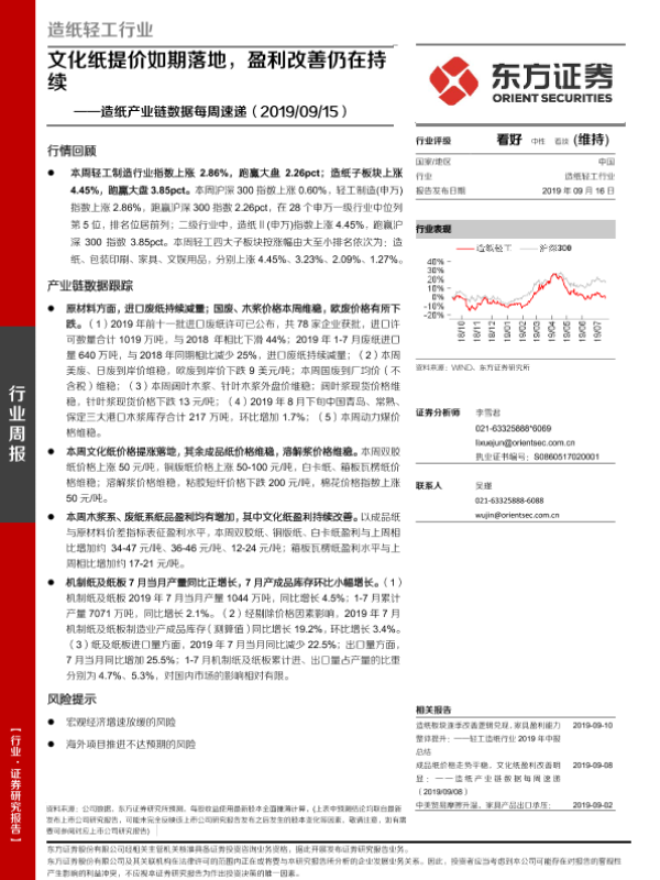 【东方证券】【20190916】造纸产业链数据每周速递:文化纸提价如期落地,盈利改善仍在持续-14页