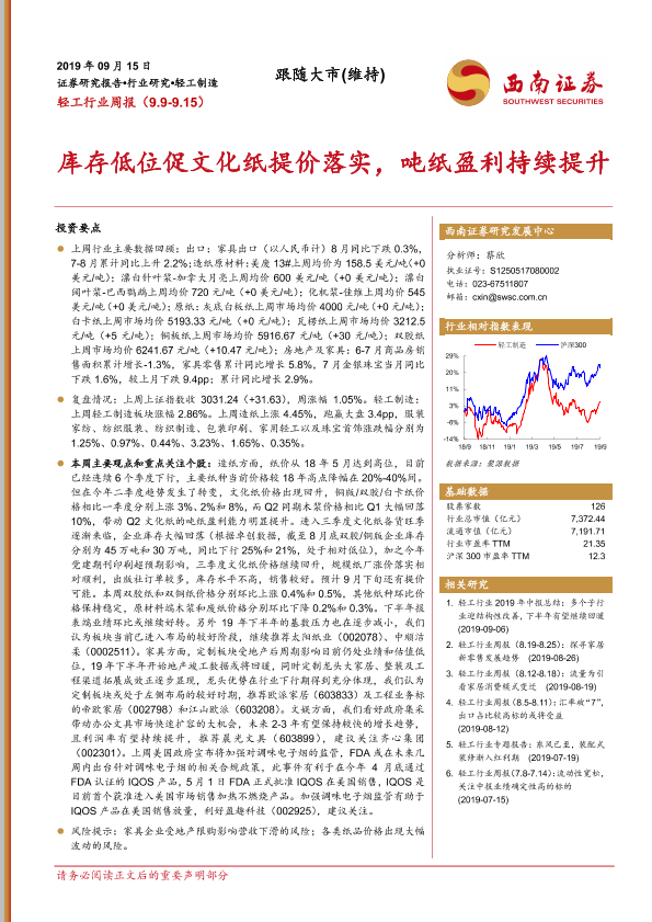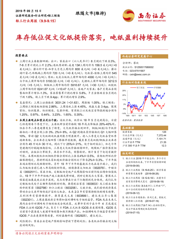 【西南证券】【20190915】20190915-西南证券-轻工行业周报:库存低位促文化纸提价落实,吨纸盈利持续提升-11页