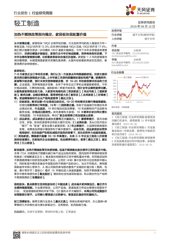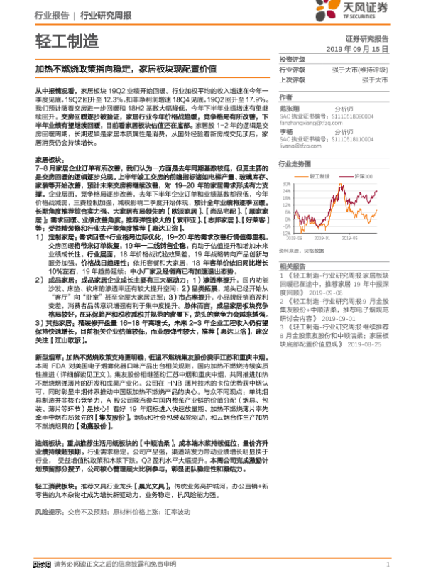 【天风证券】【20190915】20190915-天风证券-轻工制造行业研究周报:加热不燃烧政策指向稳定,家居板块现配置价值-19页