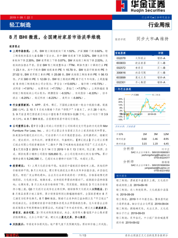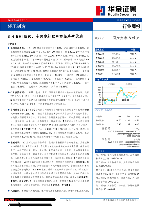 【华金证券】【20190922】20190922-华金证券-轻工制造行业周报:8月BHI微涨,全国建材家居市场淡季维稳-13页