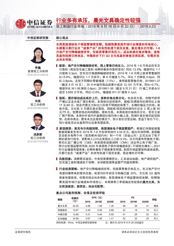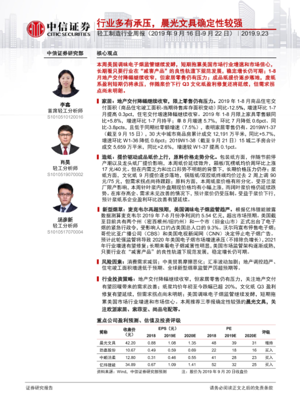 【中信证券】【20190923】20190923-中信证券-轻工制造行业周报:行业多有承压,晨光文具确定性较强-16页