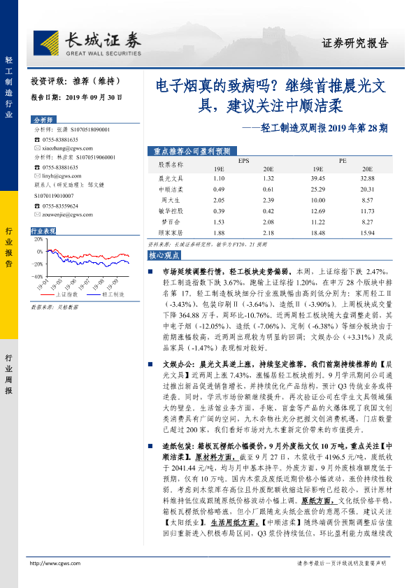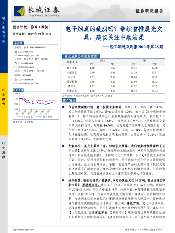 【长城证券】【20190930】20190930-长城证券-轻工制造双周报2019年第28期:电子烟真的致病吗?继续首推晨光文具,建议关注中顺洁柔-38页