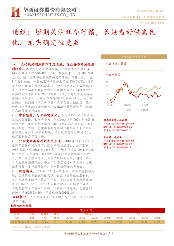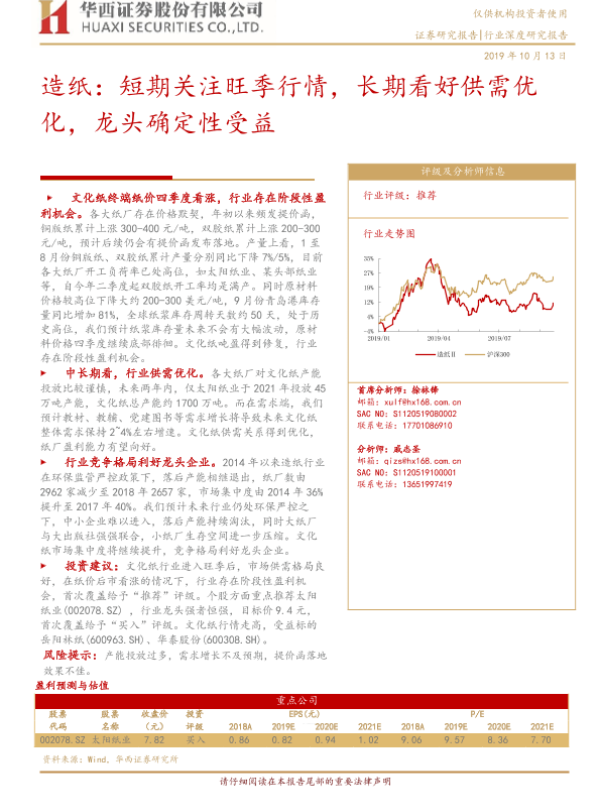 【华西证券】【20191013】造纸:短期关注旺季行情,长期看好供需优化,龙头确定性受益-30页