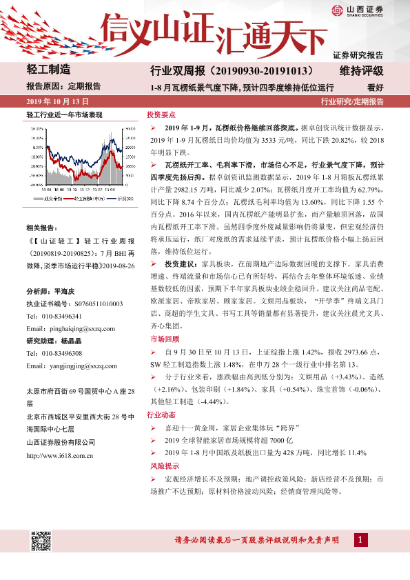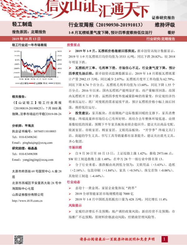 【山西证券】【20191013】轻工制造行业双周报:1-8月瓦楞纸景气度下降,预计四季度维持低位运行-13页
