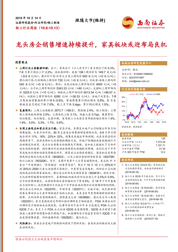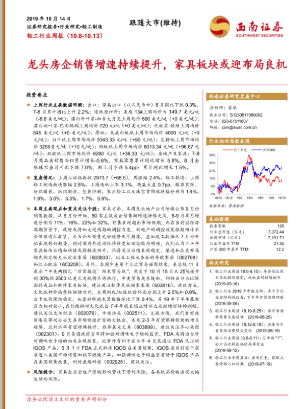 【西南证券】【20191014】20191014-西南证券-轻工行业周报:龙头房企销售增速持续提升,家具板块或迎布局良机-11页