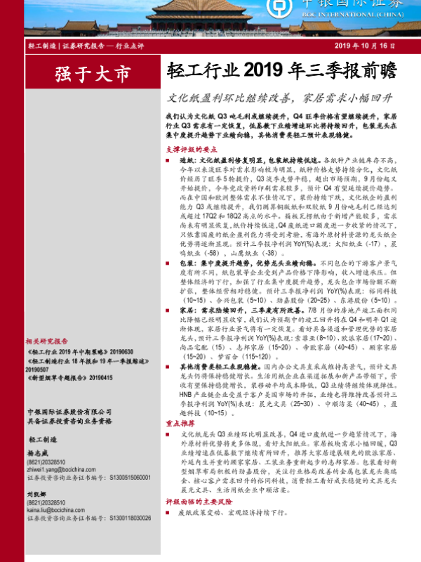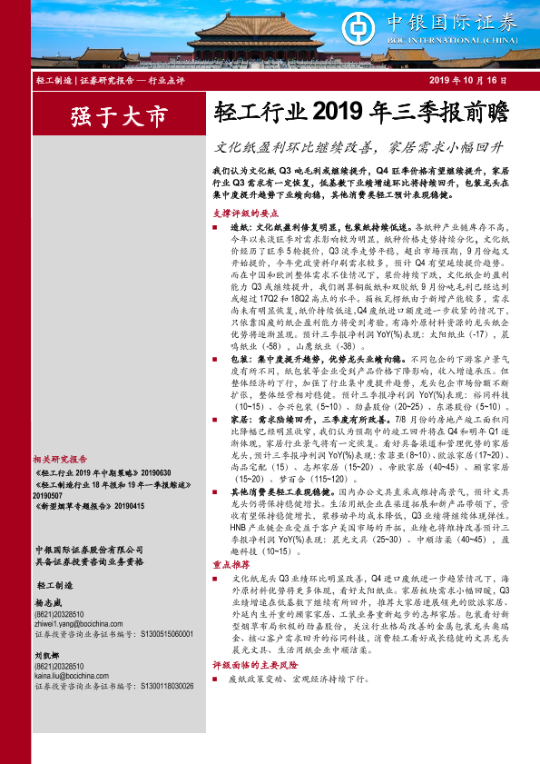 【中银证券】【20191016】轻工行业2019年三季报前瞻:文化纸盈利环比继续改善,家居需求小幅回升-6页