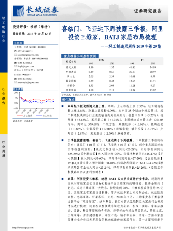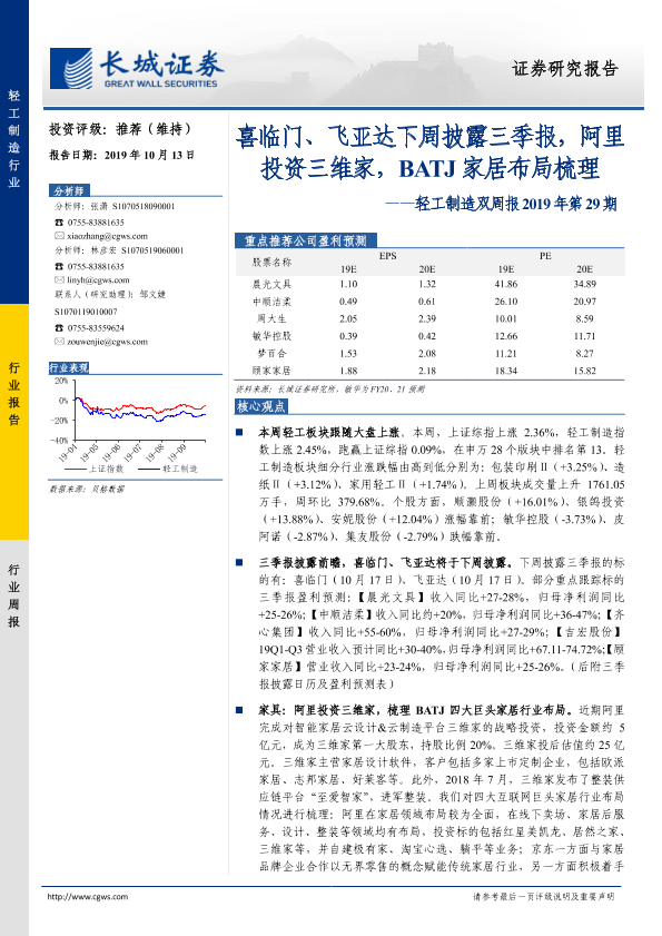 【长城证券】【20191013】轻工制造双周报2019年第29期:喜临门、飞亚达下周披露三季报,阿里投资三维家,BATJ家居布局梳理-35页