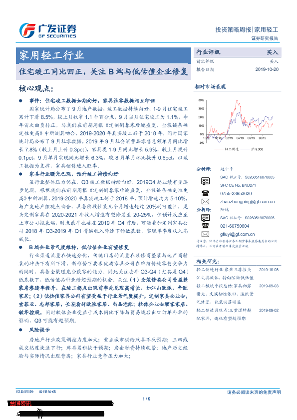 【广发证券】【20191020】20191020-广发证券-家用轻工行业投资策略周报:住宅竣工同比回正,关注B端与低估值企业修复-9页
