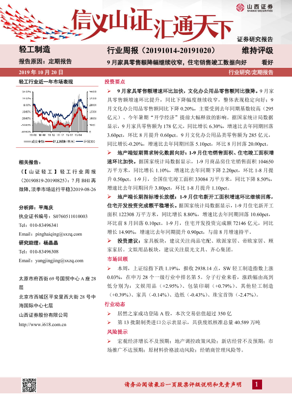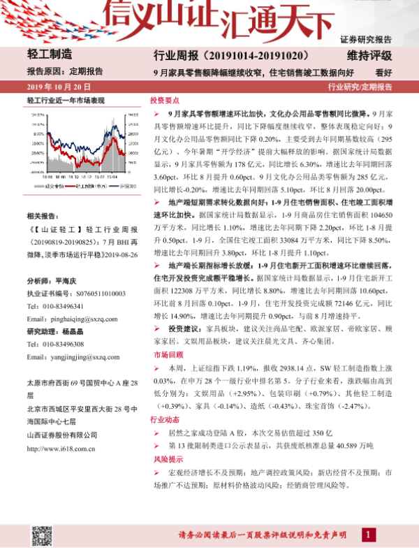【山西证券】【20191020】轻工制造行业周报:9月家具零售额降幅继续收窄,住宅销售竣工数据向好-13页