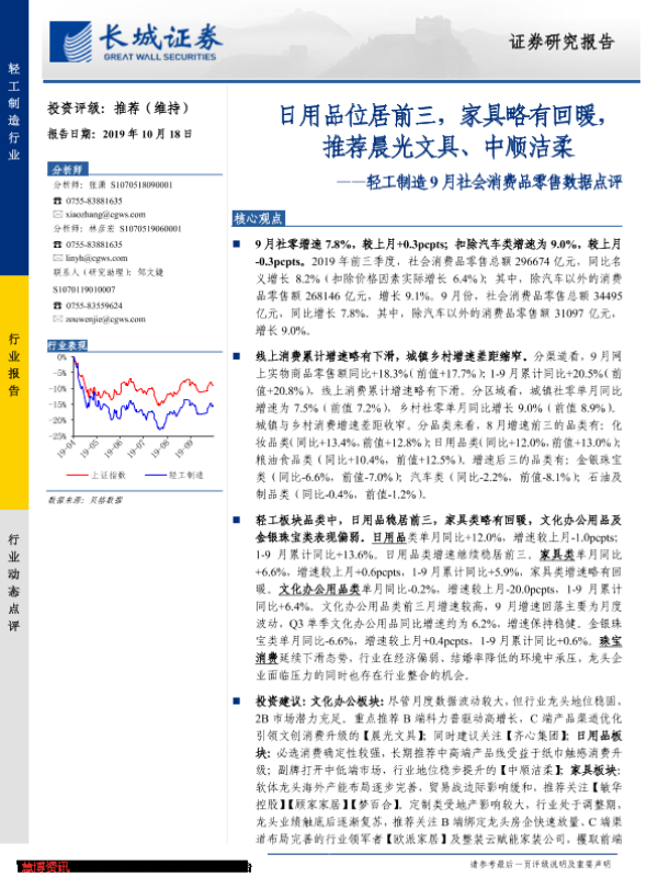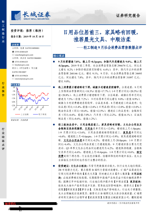 【长城证券】【20191018】轻工制造9月社会消费品零售数据点评:日用品位居前三,家具略有回暖,推荐晨光文具、中顺洁柔-5页