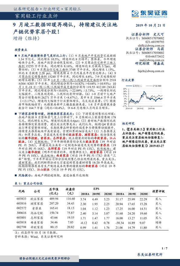 【东吴证券】【20191021】家用轻工行业点评:9月竣工数据回暖再确认,持续建议关注地产链优势家居个股!-7页