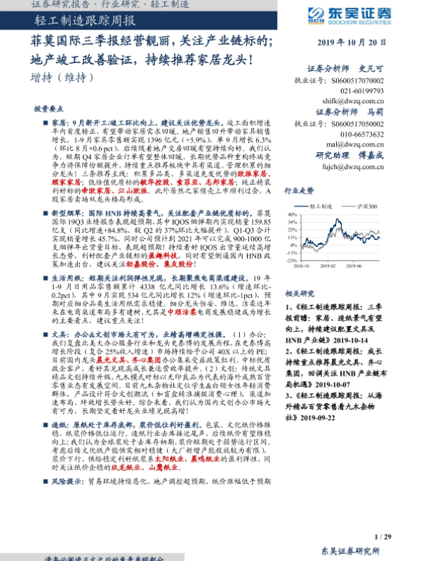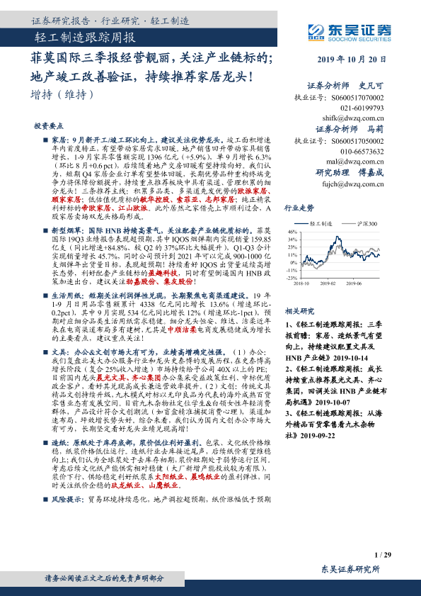 【东吴证券】【20191020】20191020-东吴证券-轻工制造跟踪周报:菲莫国际三季报经营靓丽,关注产业链标的;地产竣工改善验证,持续推荐家居龙头!-29页