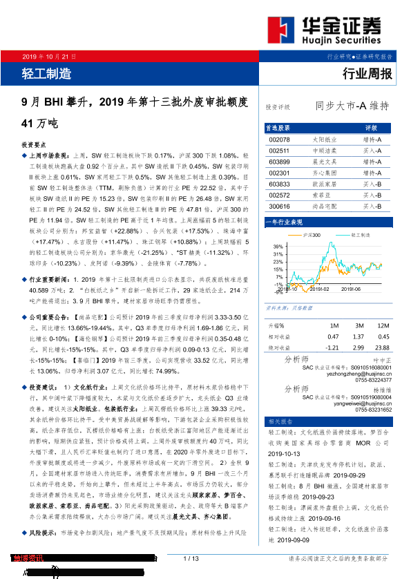 【华金证券】【20191021】20191021-华金证券-轻工制造行业周报:9月BHI攀升,2019年第十三批外废审批额度41万吨-13页