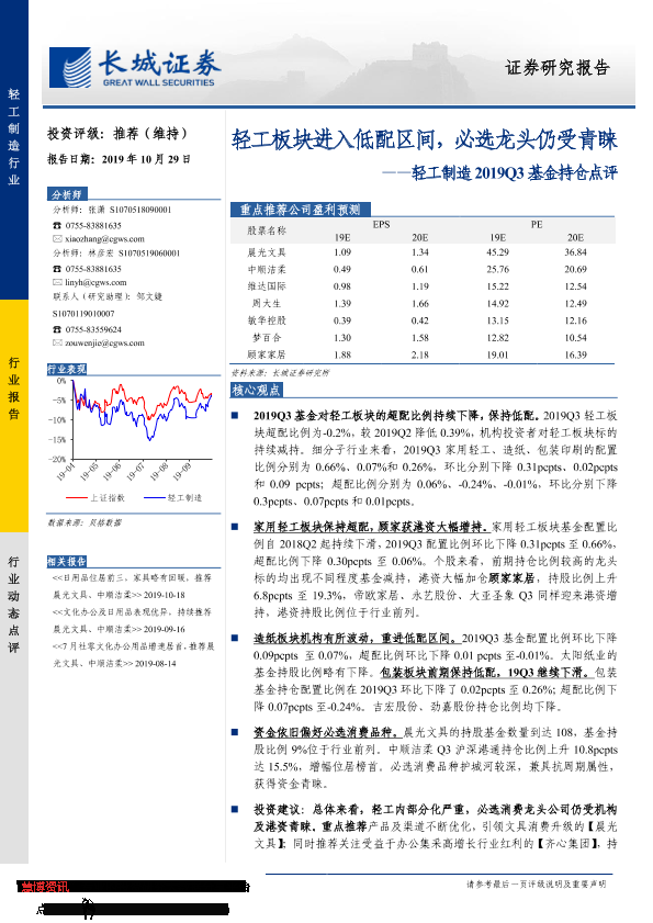 【长城证券】【20191029】轻工制造2019Q3基金持仓点评:轻工板块进入低配区间,必选龙头仍受青睐-9页