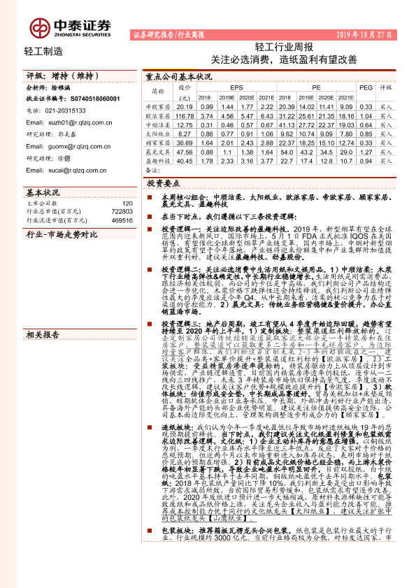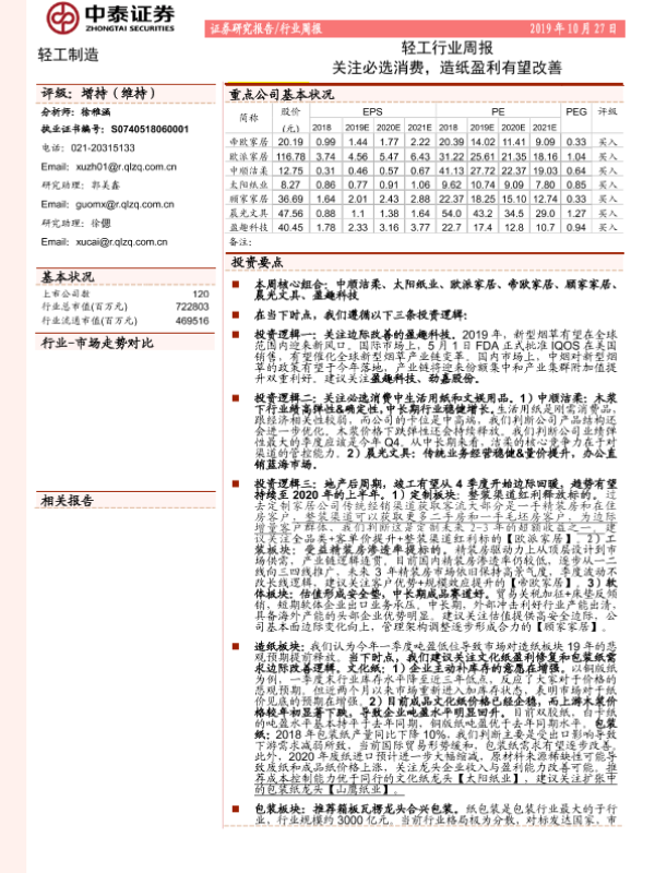 【中泰证券】【20191027】20191027-中泰证券-轻工行业周报:关注必选消费,造纸盈利有望改善-14页
