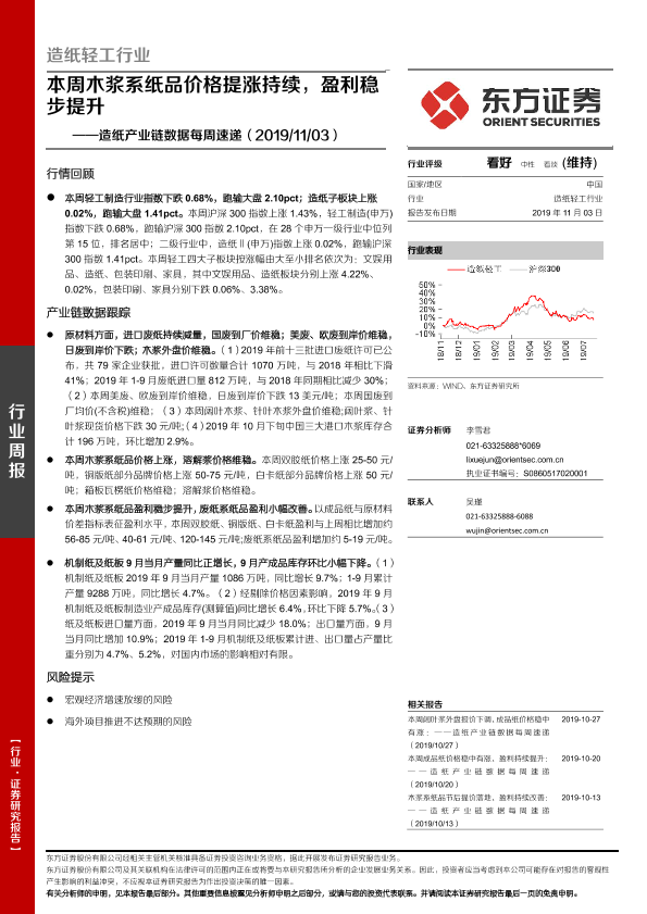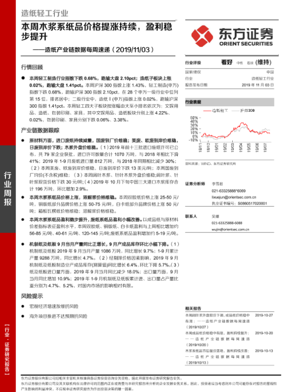 【东方证券】【20191103】20191103-东方证券-造纸产业链数据每周速递:本周木浆系纸品价格提涨持续,盈利稳步提升-15页