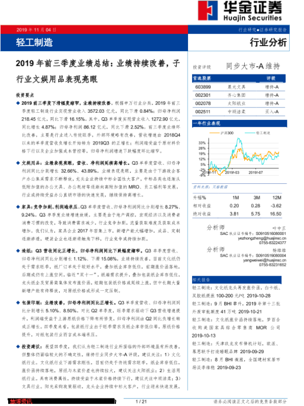 【华金证券】【20191104】2019年前三季度业绩总结:业绩持续改善,子行业文娱用品表现亮眼-21页