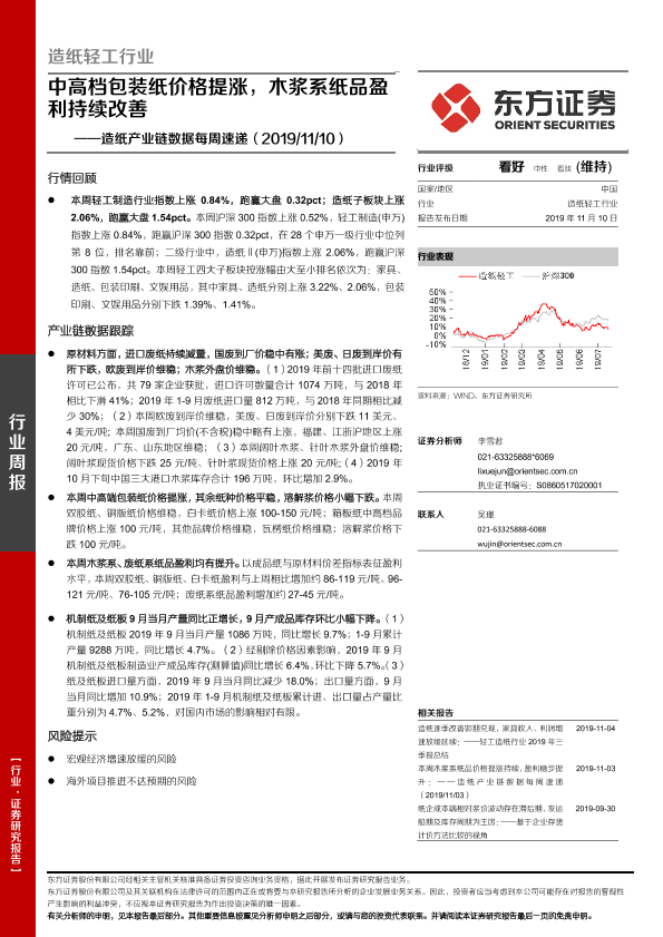 【东方证券】【20191110】20191110-东方证券-造纸产业链数据每周速递:中高档包装纸价格提涨,木浆系纸品盈利持续改善-15页