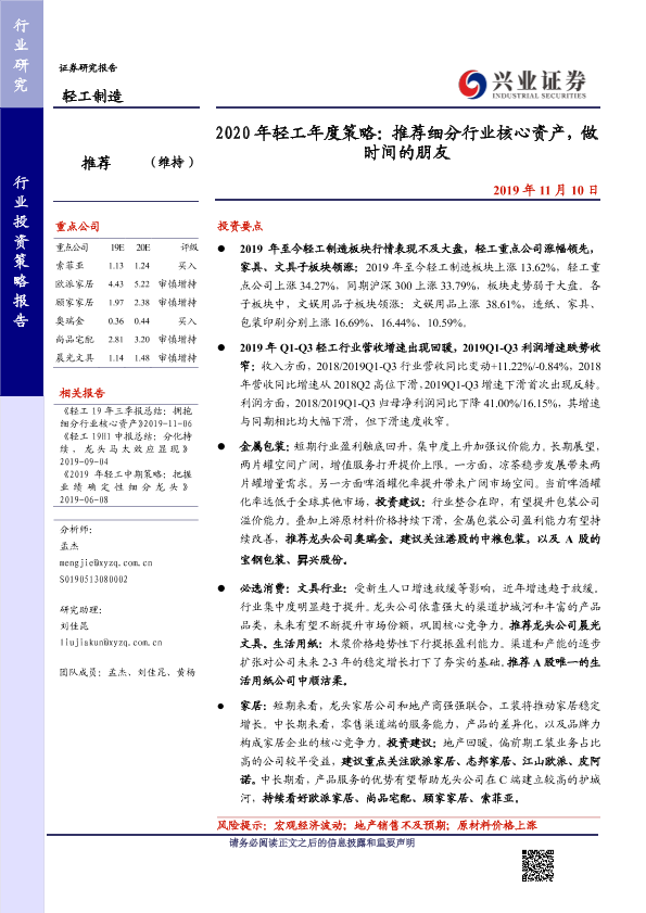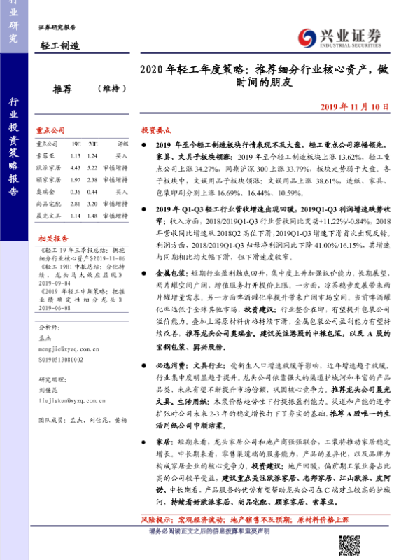 【兴业证券】【20191110】2020年轻工年度策略:推荐细分行业核心资产,做时间的朋友-43页