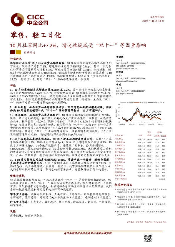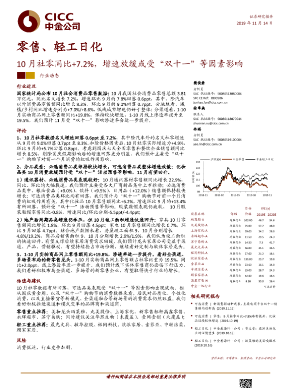 【中金公司】【20191114】零售、轻工日化行业动态:10月社零同比+7.2%,增速放缓或受“双十一”等因素影响-9页