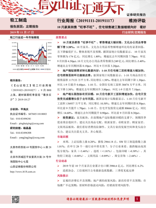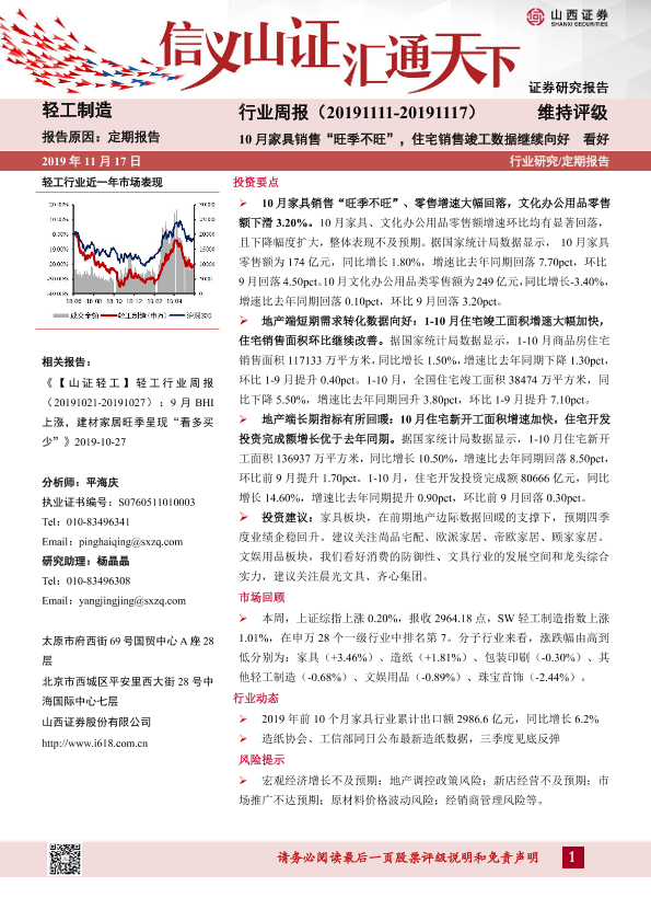 【山西证券】【20191117】20191117-山西证券-轻工制造行业周报:10月家具销售“旺季不旺”,住宅销售竣工数据继续向好-14页