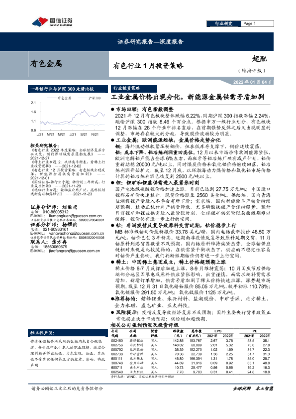 【国信证券】【20220104】有色行业1月投资策略:工业金属价格出现分化,新能源金属供需矛盾加剧-28页
