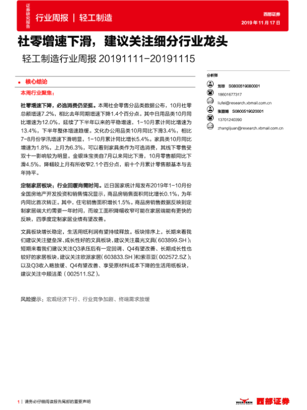 【西部证券】【20191117】20191117-西部证券-轻工制造行业周报:社零增速下滑,建议关注细分行业龙头-10页