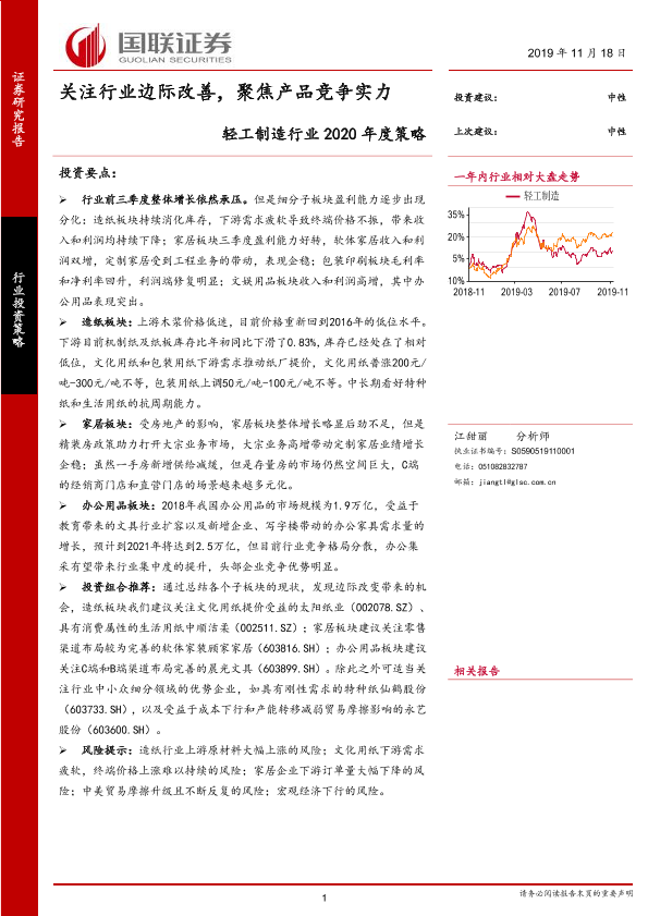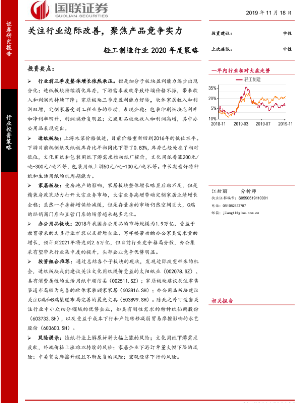 【国联证券】【20191118】轻工制造行业2020年度策略:关注行业边际改善,聚焦产品竞争实力-23页