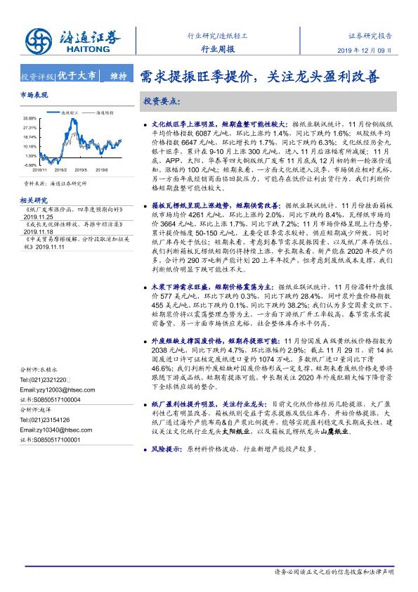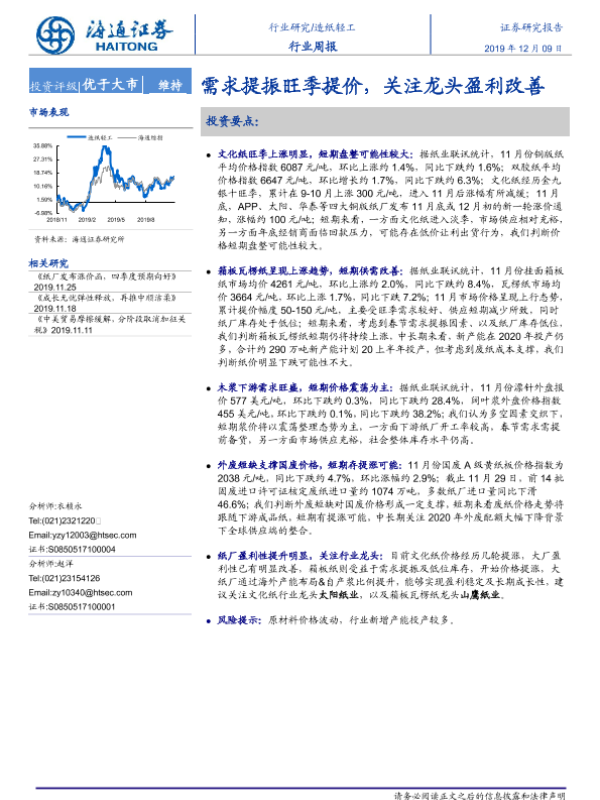 【海通证券】【20191209】20191209-海通证券-造纸轻工行业周报:需求提振旺季提价,关注龙头盈利改善-6页