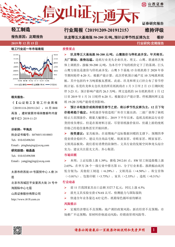 【山西证券】【20191215】20191215-山西证券-轻工行业周报:玖龙等五大基地涨50-200元吨,预计以季节性反弹为主-14页