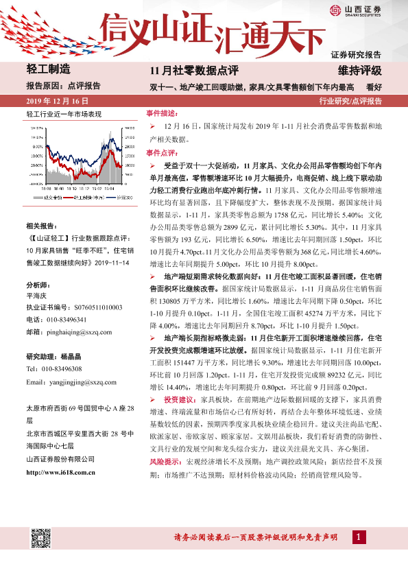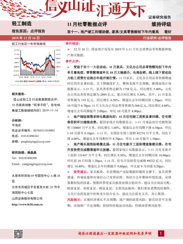 【山西证券】【20191216】20191216-山西证券-轻工制造:11月社零数据点评:双十一、地产竣工回暖助燃,家具 文具零售额创下年内最高-4页