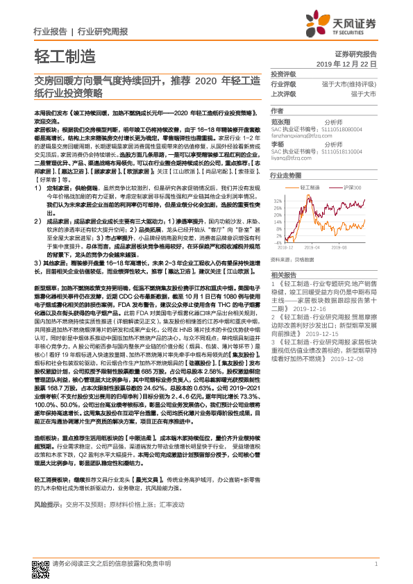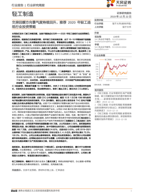 【天风证券】【20191222】轻工制造行业研究周报:交房回暖方向景气度持续回升,推荐2020年轻工造纸行业投资策略-24页