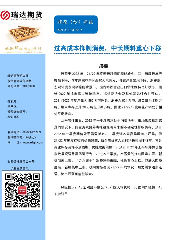 【瑞达期货】【20211220】棉花(纱)年报:过高成本抑制消费,中长期料重心下移-20页