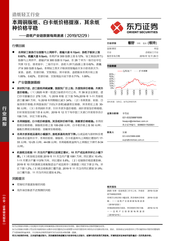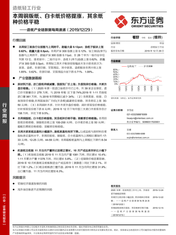 【东方证券】【20191229】20191229-东方证券-造纸产业链数据每周速递:本周铜版纸、白卡纸价格提涨,其余纸种价格平稳-15页